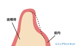 点線部分は本来あった歯槽骨の厚みです。歯を失ってから時間が経過している場合、周囲の歯槽骨(しそうこつ)が吸収され、骨が吸収して痩せていきます。
