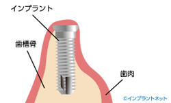 イラストは、歯槽骨が吸収され、インプラントの表面が露出している状態です。十分な骨量を確保するためにGBR(骨誘導再生)など骨を足す治療が必要でしょう。