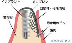 再生させたい骨組織をインプラントを支柱にして、人工メンブレン(専用の膜)で覆うことで、骨組織の誘導再生を可能にします。